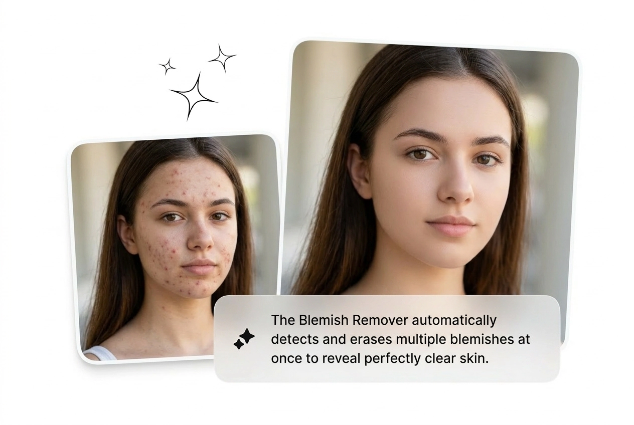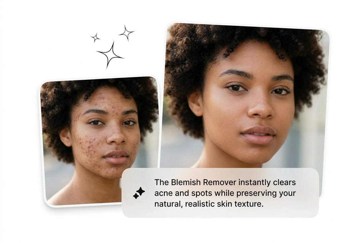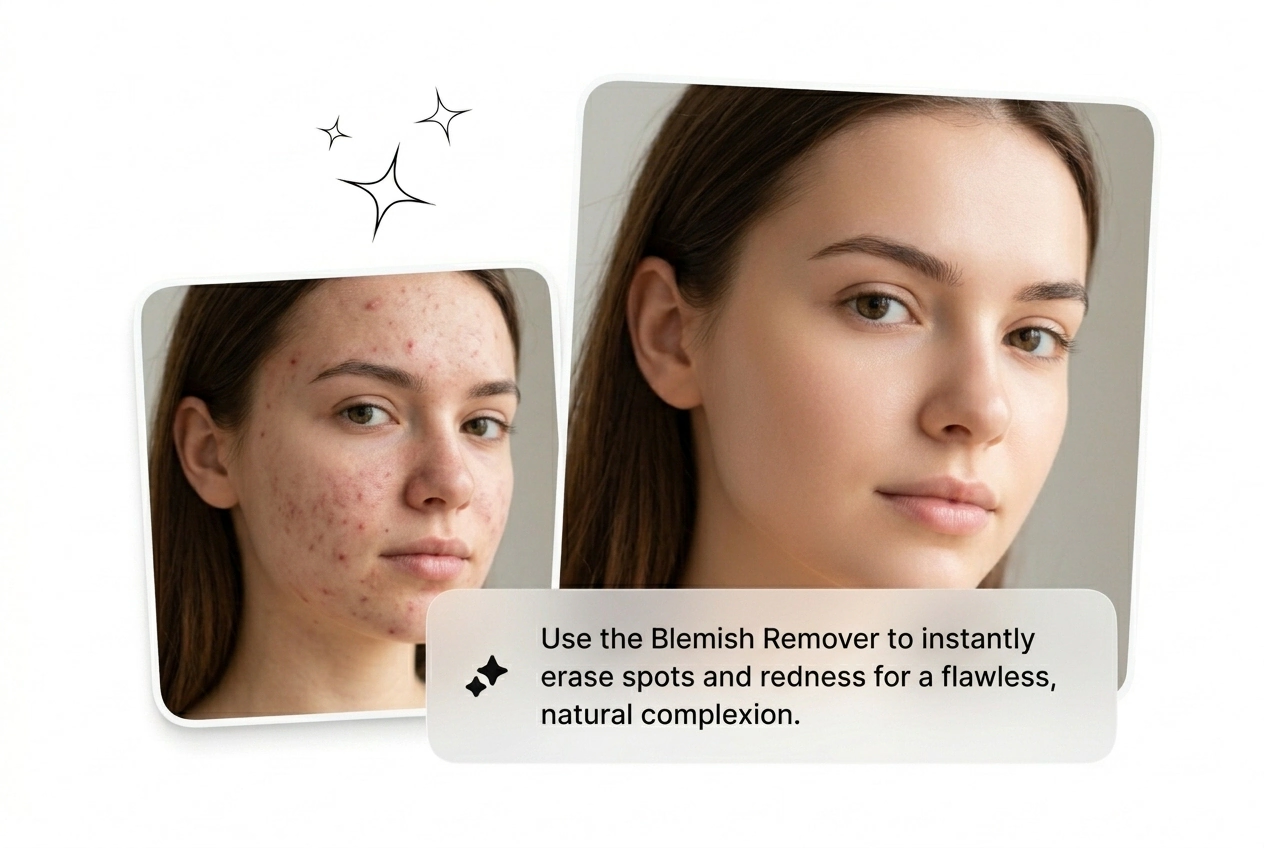 Sto zdjęć produktowych wróciło z odblaskami, odstającymi włosami i widocznym pryszczem na brodzie modelki. Usuwanie niedoskonałości ze zdjęć przetworzy całą partię online, za darmo, przed poniedziałkową akceptacją klienta. Dostarcz czyste zdjęcia bez ponownego wynajmowania studia.