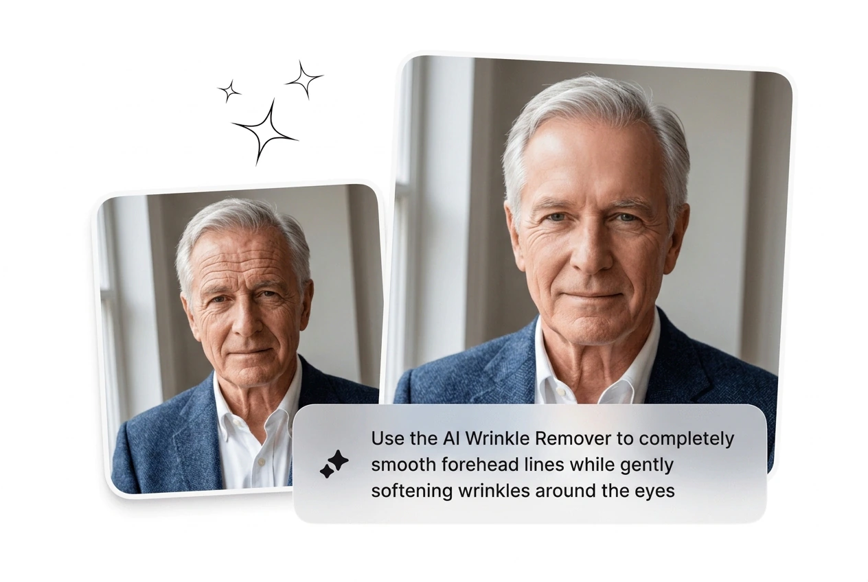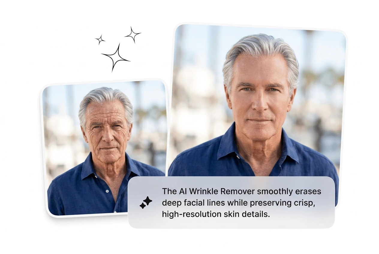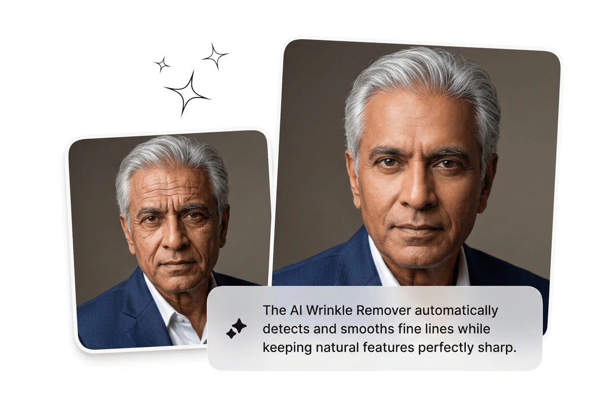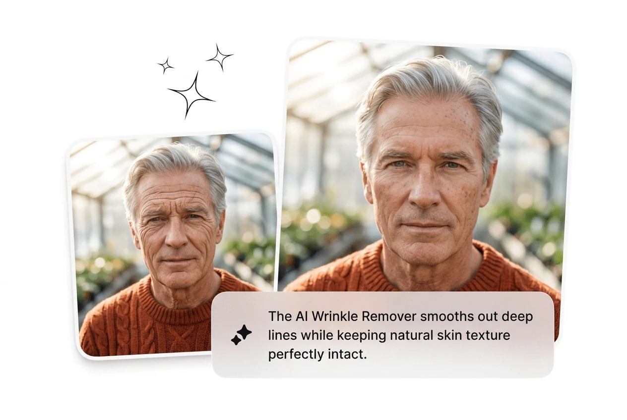 Shooting 40 product portraits in a day means retouching stacks up fast. The wrinkle filter auto processes faces so the batch ships clean without a separate Photoshop pass. More images out, same deadline, no bottleneck on the back end.